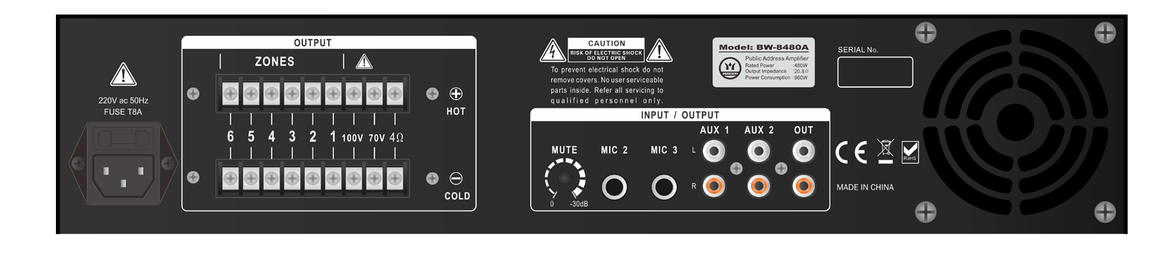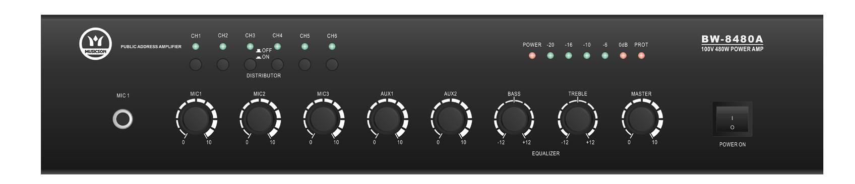 2 Modelos distintos conforman la serie de Amplificadores BW-8A para instalaciones de Línea de 70V, 100V  o baja impedancia (4-16Ohm.), con distribuidor individual para controlar 6 ZONAS distintas . Incluye piezas  para ser instaladas en Rack de 19” CARACTERÍSTICAS :  * 3 ENTRADAS DE MICRÓFONO  * 2 ENTRADAS AUXILIARES  * 1 SALIDA AUXILIAR PARA LINK   * AMPLIFICADOR CON MEZCLADOR MULTIFUNCIÓN  * CONTROL DE VOLUMEN INDIVIDUAL POR ENTRADA  * CONTROL DE VOLUMEN GENERAL – MASTER  * CONTROLES DE TONO (GRAVES Y AGUDOS)  * TRANSFORMADOR AISLADO PARA SALIDAS DE 70V,100V Y BAJA IMPEDANCIA  * SIRENA DE PRIORIDAD PARA OTRAS ENTRADAS  * DISTRIBUIDOR INDIVIDUAL PARA 6 ZONAS  * SISTEMA DE PROTECCIÓN CONTRA CORTOCIRCUITOS EN SALIDAS Y ALARMA.